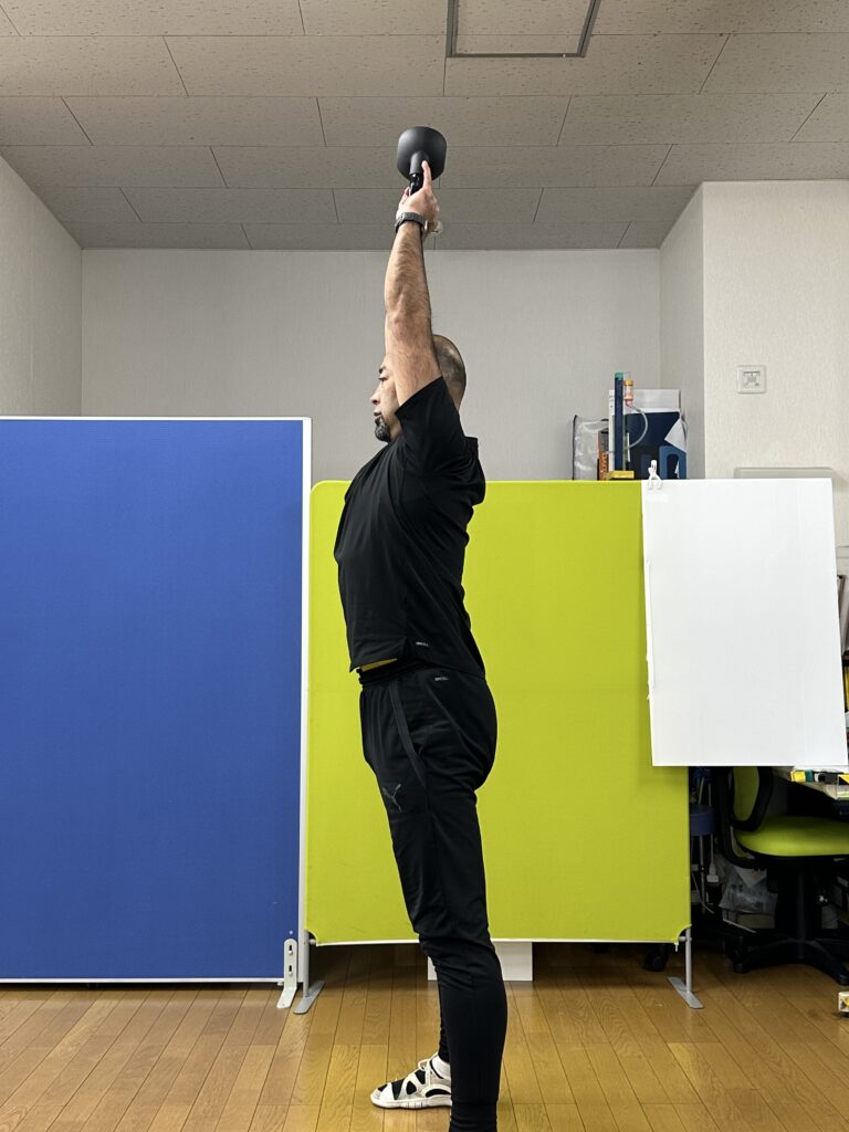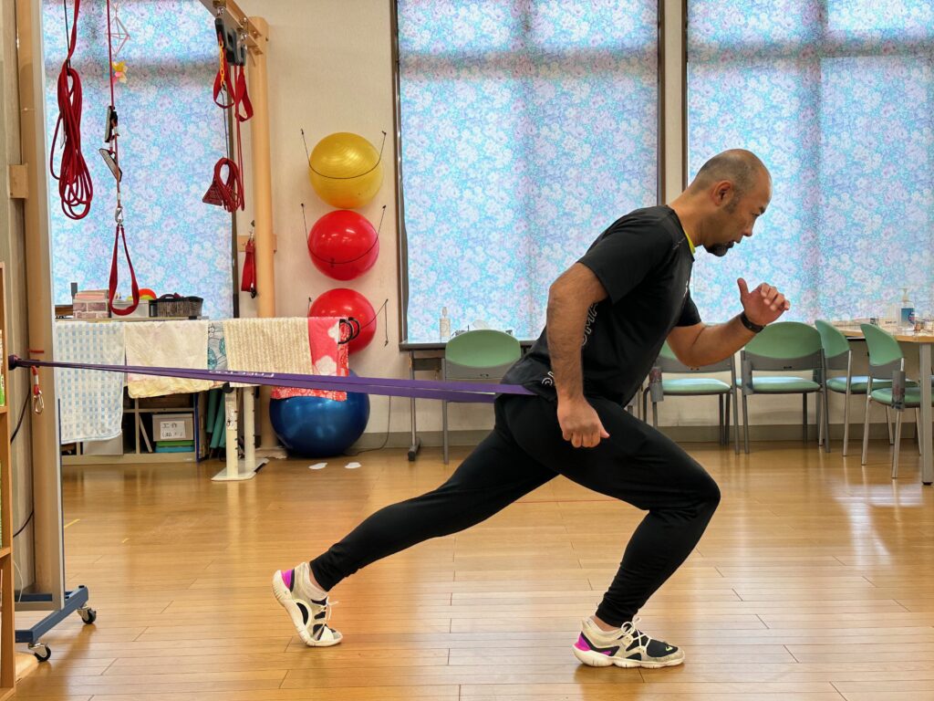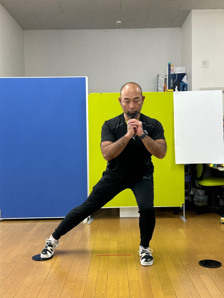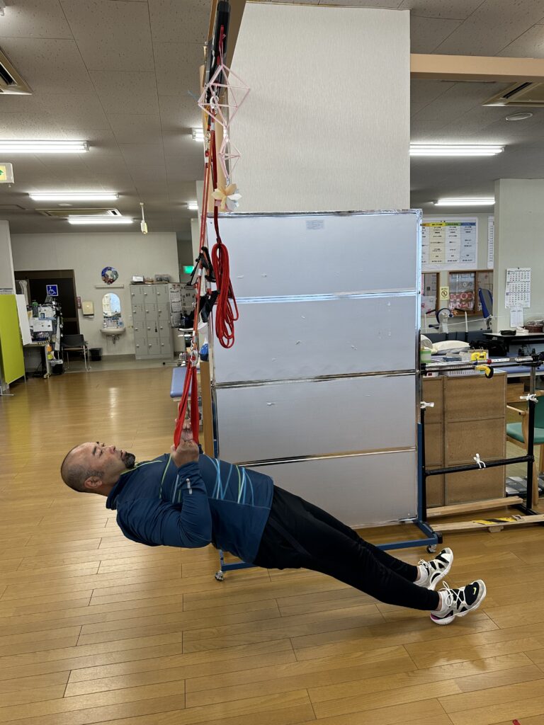 ウォーターバッグという中に水が入ったバッグを担いで行うことで、不安定な環境下でトレーニングを行う。